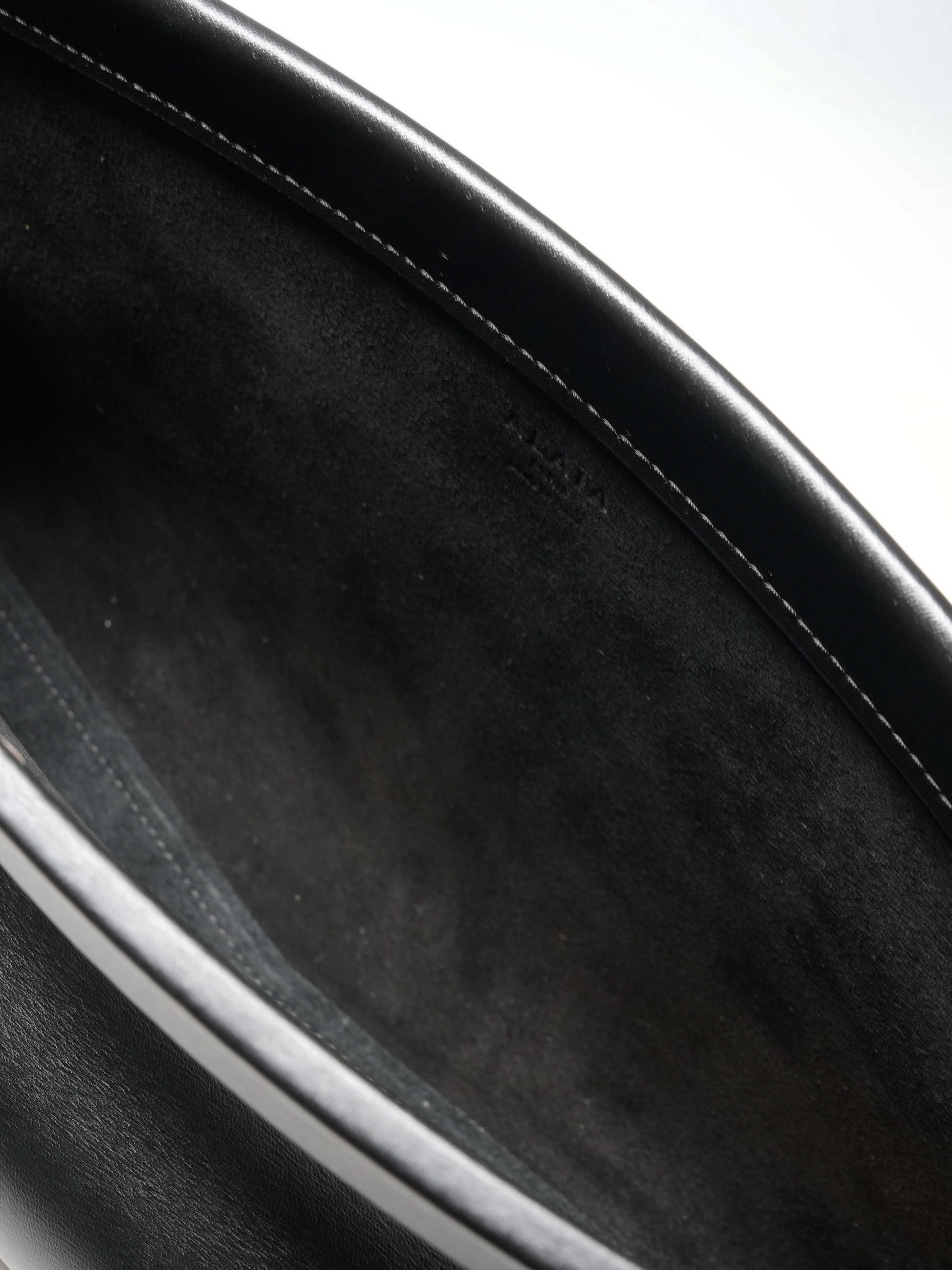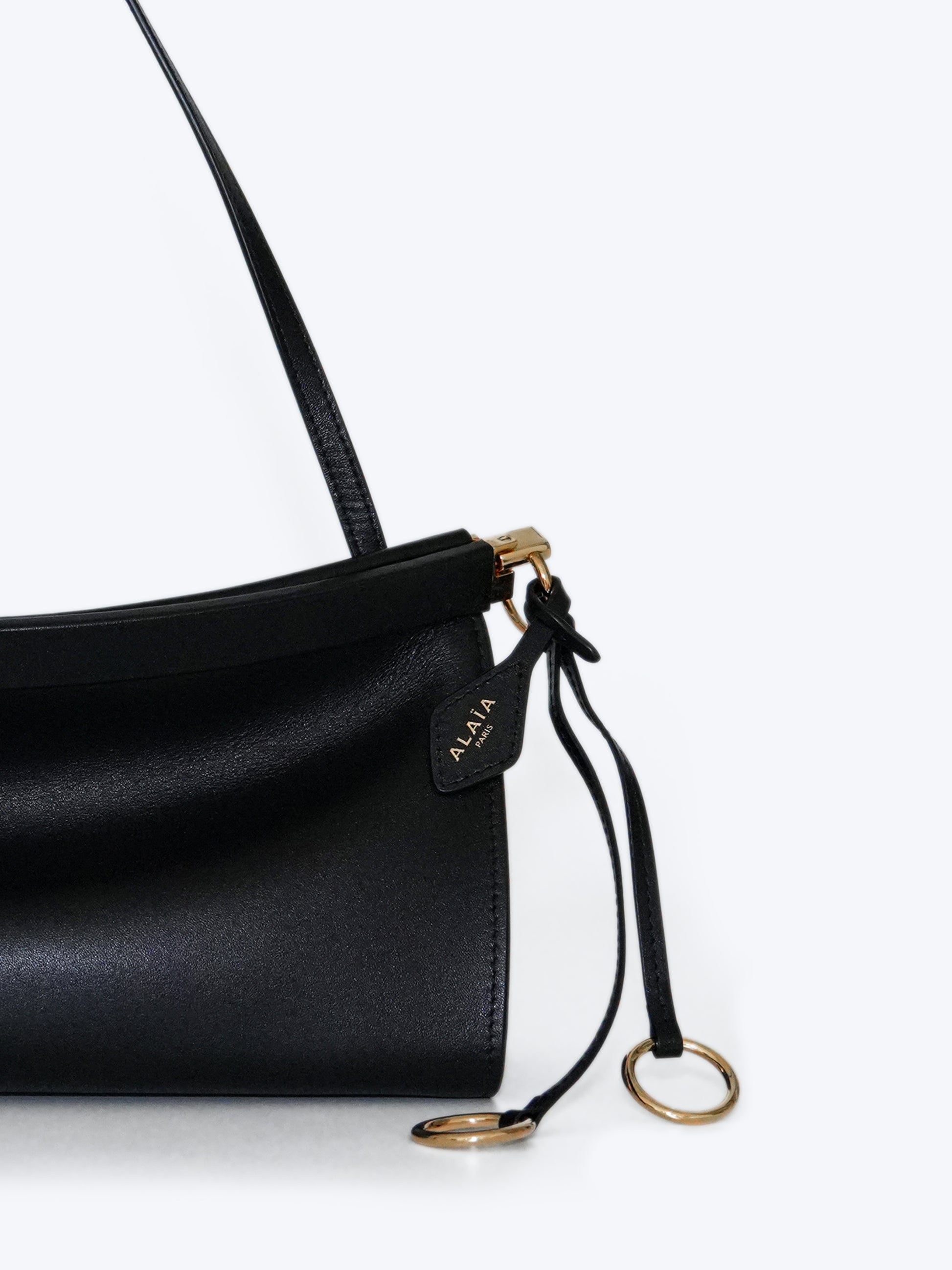 The Alaïa Le Click East/West Medium Baguette Bag in black features soft 100% calfskin leather, a curved silhouette, leather-wrapped hinge, signature folds, decorative ties, and an adjustable strap for versatile carry.